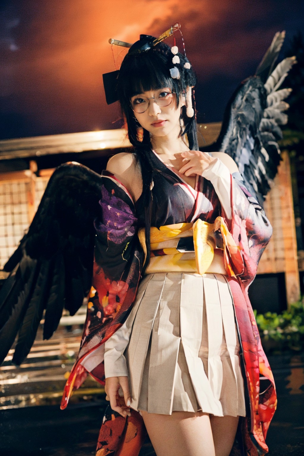 女天狗(Nyotengu)傳統畫作,生死皆可。畫面中心是一位留著黑色長髮和瀏海的女子。她穿著一件色彩艷麗的和服,融合了紅色、黃色和紫色。和服高領短裙的設計更能襯托出她端莊的氣質。頭上戴著一條設計精巧的花形髮帶。背後是一對黑色的翅膀,與髮帶相得益彰,賦予她一種空靈之美。女子站在一座傳統的日式建築前,這座建築以木板和瓦片屋頂為特色。背景中懸掛的紅燈籠進一步強化了這種氛圍,暗示著一場文化活動或儀式。儘管描述詳盡,但畫面中沒有任何文字。畫面中各元素的相對位置經過精心設計,女子位於前景,傳統日式建築則在她身後,現代與傳統元素形成了鮮明的對比。這張照片捕捉了時間凝固的瞬間,傳統與現代在此交融,每個元素都共同描繪出一幅生動的文化圖景。