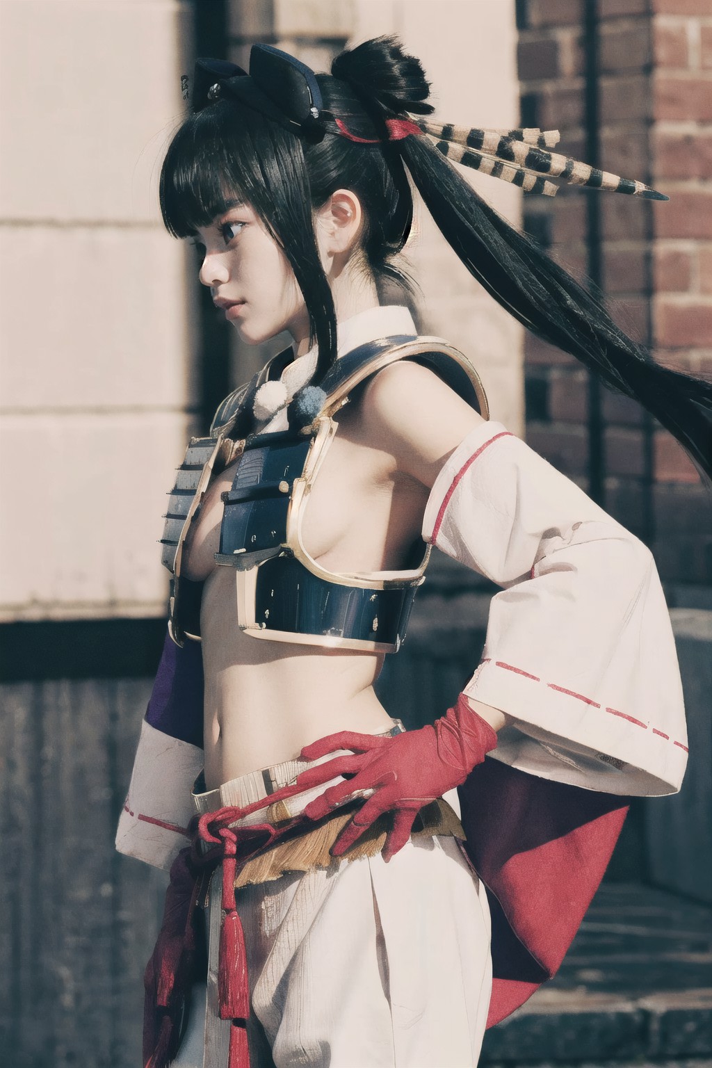 牛若丸,《Fate/Grand Order》插圖。畫面中,一位身著傳統日式服飾的年輕女子,倚靠在一面有窗戶的磚牆前。她的服飾以白色和紅色為主色調,並點綴著藍色和金色。頭飾以黑色羽毛為特色,更添一份優雅。她雙手輕柔地叉腰,姿態自信從容。目光看向左側,神情莊重,為畫面增添了肅穆之感。儘管畫面色彩豐富、細節繁多,但所有元素都巧妙地融合在一起,共同構成了一幅和諧的畫面,而女子的傳統日式服飾則成為了畫面的中心。