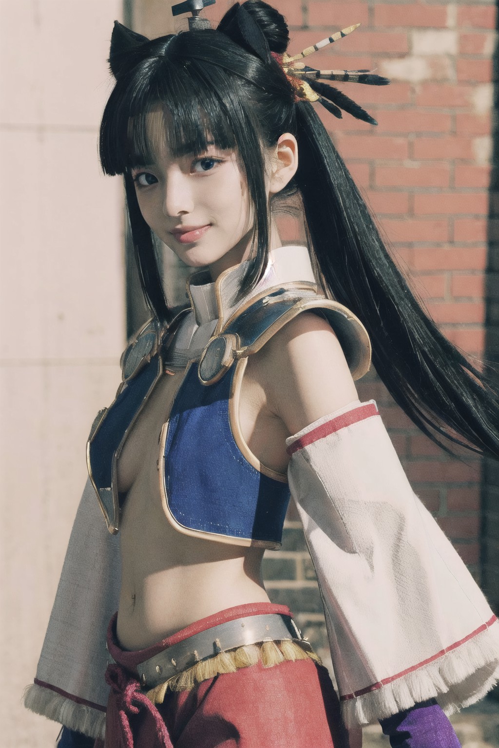 牛若丸,《Fate/Grand Order》插畫中,一位年輕女子自信地倚靠在磚牆前。她頭戴黑金相間的髮箍,更添幾分優雅氣質。她穿著傳統的日式服飾,包括一件藍白相間的和服,腰間繫著一條鮮豔的紅色腰帶。和服本身做工精美,繁複的紋樣更顯層次感。金色的臂環與和服相得益彰,為整體造型增添了一絲高貴的氣息。她手中分別握著兩件物品:一手是藍白相間的扇子,另一手是黑金相間的劍。扇子鮮豔的色彩與劍的深沉色調形成鮮明對比,營造出強烈的視覺衝擊。女子在畫面中的位置略偏左側,吸引我們的目光。儘管如此,她的視線似乎卻投向遠方,讓人感覺畫面之外似乎隱藏著什麼人或事。她的姿態展現出一種準備充分和堅定的決心,彷彿即將投入一場舞蹈、一場戰鬥,或者兩者兼而有之。總而言之,這幅畫面捕捉到了一個凝固的瞬間,講述了一個身著日本服飾的年輕女子所體現的傳統、力量和優雅的故事。
