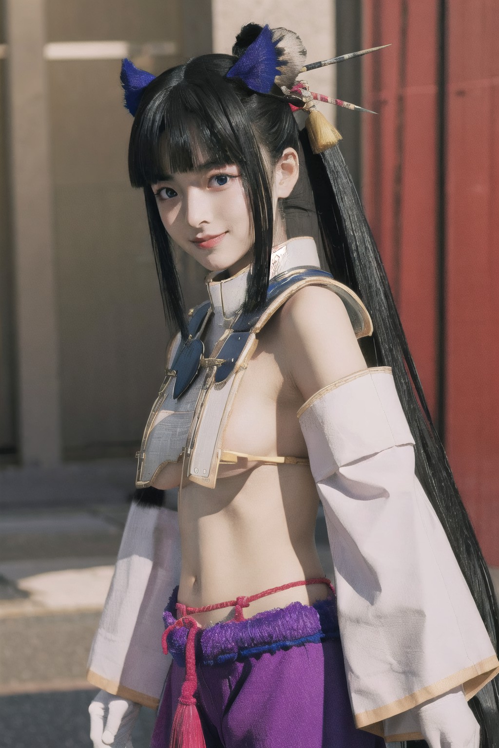 牛若丸,《Fate/Grand Order》插畫。畫面中是一位年輕女子,頭髮上有藍色髮夾,穿著傳統日式服飾。這套服飾以紫色和白色為主色調,腰間繫著粉紅色腰帶,更顯醒目。她佩戴的兩條金色項鍊也為整體造型增添了幾分精緻感。她手中握著一把劍,象徵力量與勇氣,神情嚴肅,為畫面增添了莊嚴的氣息。背景是一扇紅色的門和一面白色的牆,簡潔卻不失效果,將視線完全集中在女子身上。畫面中沒有任何文字或其他物品。畫面中,女子位於前景,紅色的門和白色的牆壁則位於她的身後。她手中的劍位於腰間,藍色髮夾則固定在頭頂。項鍊從頸間垂下,為她的整體造型增添了一絲優雅。這段詳細描述根據圖像的可見內容準確地展現了圖像內容,不包含任何推測或虛構的元素。