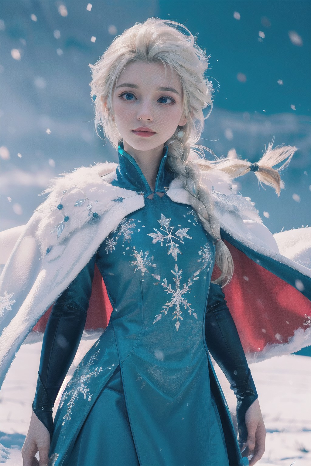 圖片中的艾莎(Elsa)來自《冰雪奇緣》(Frozen)。畫面中,一位年輕女孩站在白雪皚皚的雪景中。她金色的長髮披散在臉龐周圍,點綴著潔白的雪花。女孩身穿藍色連身裙,飾以紅色和白色的小細節。她手中拿著一條鑲有紅色邊的白色長圍巾。頭頂是湛藍的天空,背景飄落漫天飛舞的雪花,營造出一幅寧靜祥和的冬日景象。畫面中沒有任何文字或其他物體。女孩似乎獨自置身於這片雪景之中,更增添了畫面的靜謐之感。