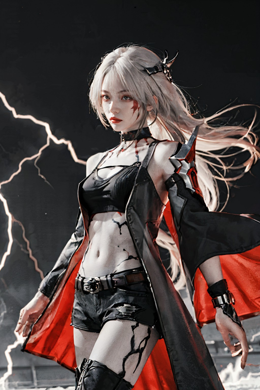 崩壞星軌,阿刻戎。畫面中心是一位擁有金色長髮、醒目紅眸的女子。她穿著與項鍊相呼應的黑紅服飾,更添幾分優雅。她的目光看向一旁,似乎正在沉思,或是注視著畫面之外的事物。她佇立於純黑的背景前,更顯其作為畫面唯一主體的地位。更添神秘感的是,她頭部兩側各有一道閃電。左側的閃電距離較近,也顯得更加耀眼,與右側的閃電形成了一種不對稱的構圖。女子的服飾和閃電或許暗示著某種奇幻或神話場景,但由於缺乏更多背景訊息,這仍屬推測。畫面中沒有任何可辨識的文字或其他物體。畫面中各物體的相對位置不變:女子居於中心,閃電位於兩側,黑色背景則將所有事物包裹其中。