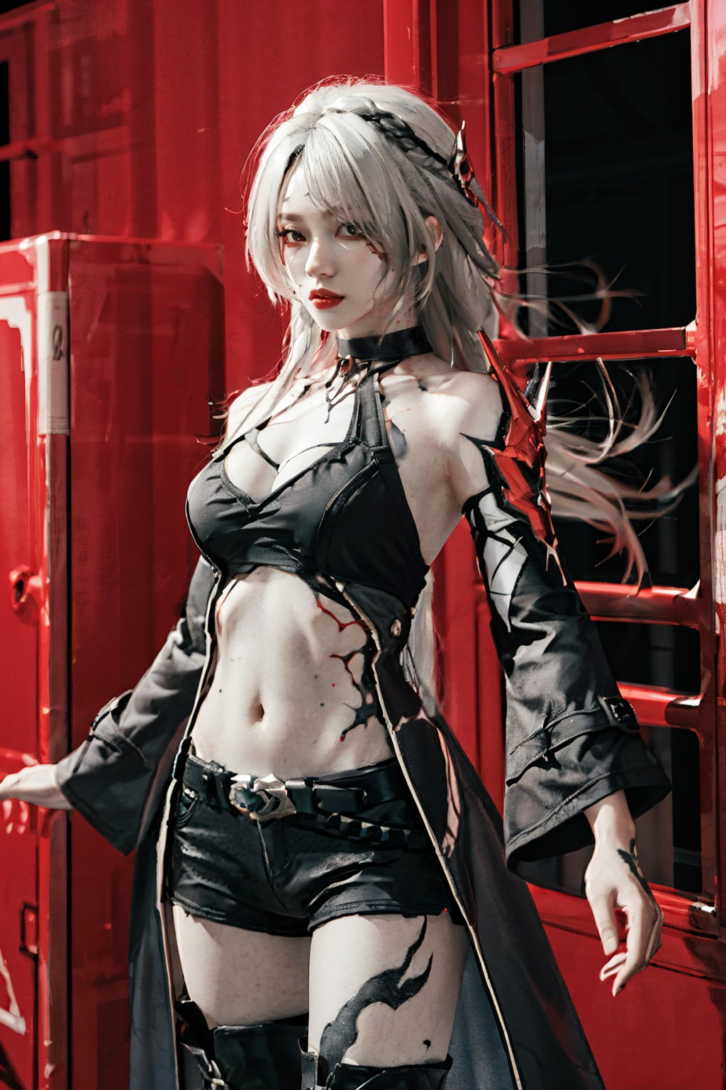 《崩壞星軌》中的阿刻戎,畫面中一位女子自信地站在鮮豔的紅色背景前。她綁著俏皮的雙馬尾,為整體造型增添了一絲靈動感。她穿著一套醒目的黑白服裝,與紅色背景形成鮮明對比。她的上衣設計獨特,胸部和腹部都採用了鏤空設計,為整體造型增添了一絲神秘感。這些鏤空位置經過精心設計,既突出了她的腰部線條,又保持了一定的含蓄。她所穿的裙子同樣是黑白相間的,但一側開衩極高,露出部分腿部。這一細節為畫面增添了一絲動感,暗示著她可能正在移動。她雙手叉腰,姿態自信,進一步凸顯了她果敢的個性。她所站的紅色背景並非純紅色——上面有一些文字,儘管從這個角度看不清細節。總的來說,這張照片捕捉到了一個自信而時尚的瞬間,女性的穿著和姿態成為了畫面的焦點。