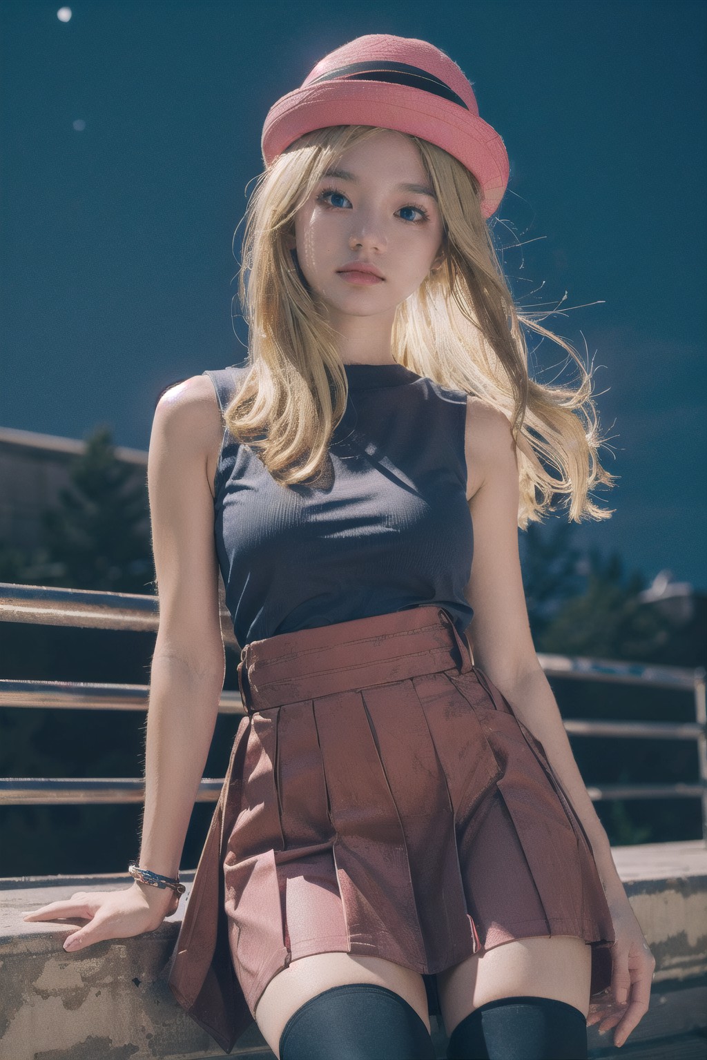 賽蕾娜,寶可夢。畫面中,一位年輕女子靜靜地沉思著。她坐在金屬長椅上,頭頂是浩瀚無垠的夜空,深藍色的夜空在她身後緩緩展開。她穿著時尚休閒的裝束,黑色背心搭配粉紅色短裙,為整體造型增添了一抹亮色。她一頭波浪長髮自然垂落,與頭戴的白色帽子相得益彰。帽子上裝飾著一根羽毛,更添幾分俏皮。她的目光投向遠方,沉浸在思緒中,彷彿在探索宇宙的奧秘。畫面中沒有任何文字或可辨識的物體,所有的一切都聚焦在女子和她沉思的狀態。女子坐在長椅上,夜空在她身後緩緩展開,兩者之間的相對位置始終保持不變。這幅畫面捕捉了她獨處的瞬間,完美地展現了這寧靜祥和的景象。