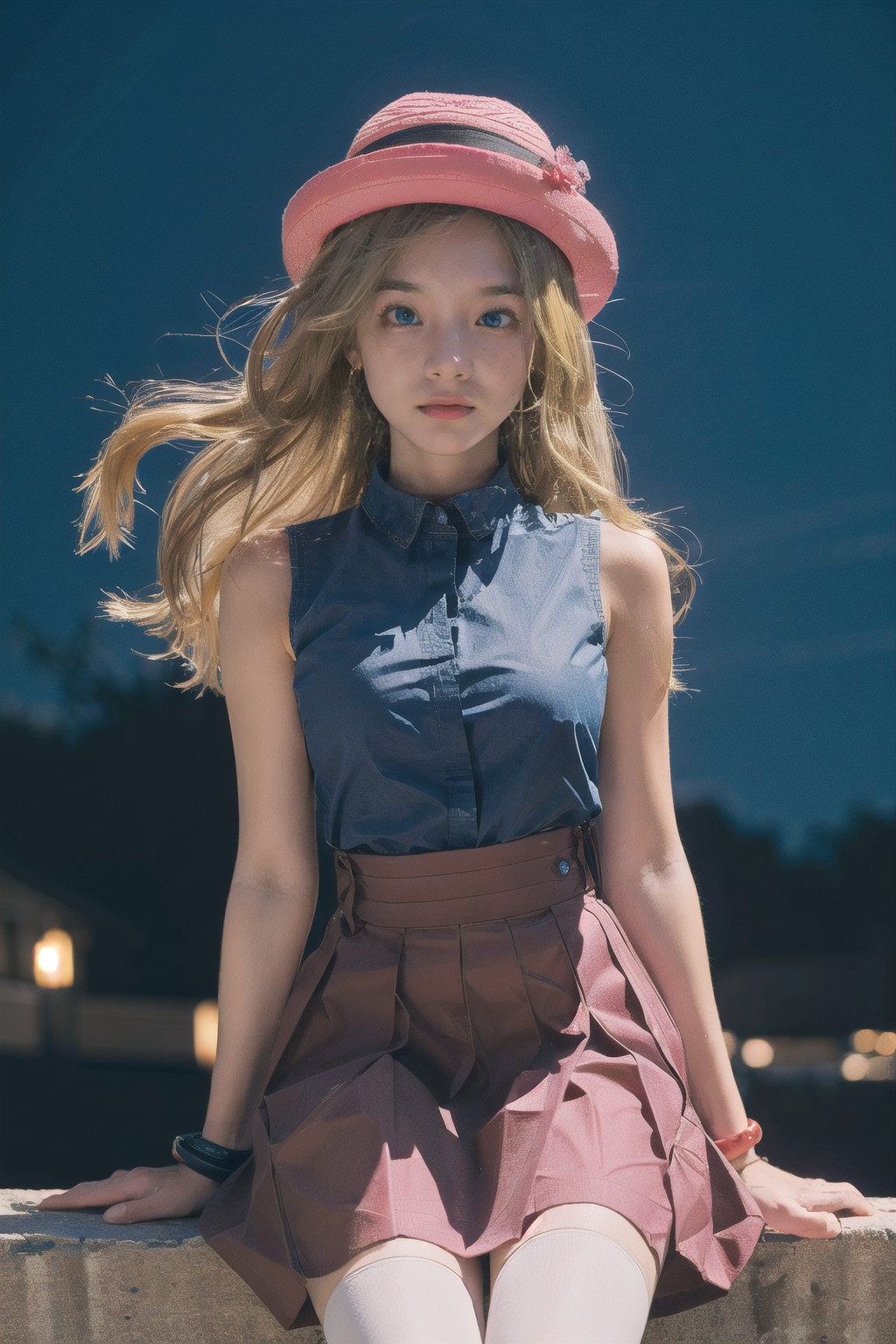賽蕾娜,寶可夢。畫面中心是一位年輕女子,散發著寧靜祥和的氣息。她盤腿坐在水泥長椅上。她的裝束色彩搭配十分醒目:一頂粉紅色帽子在夜空的映襯下格外醒目,搭配一條與之相襯的藍色連衣裙。洋裝腰間繫著一條深棕色腰帶,更添幾分優雅氣質。她所坐的長椅背後,是月光下挺拔的樹木,樹影在夜色中勾勒出清晰的輪廓。遠處還能看到一棟建築,只是隱約可見,並未直接展現。她的目光看向一旁,似乎被畫面之外的某物或某人所吸引。這一切,再加上她寧靜的神情,共同營造出一種夢幻般的氛圍。儘管身處戶外,畫面卻瀰漫著一種親密的氛圍,彷彿她正與親近之人分享一段靜謐時光。畫面中沒有任何明顯的文字或其他物體。女子、長椅、樹木和建築物的相對位置構成了一幅和諧的構圖,引導觀者的視線遊走於畫面之上。女子位於構圖的中心,背景元素提供了必要的背景,卻並未喧賓奪主。總而言之,這張照片捕捉了某個瞬間,在滿月夜空的映襯下,凝固成永恆的畫面。這是一幅充滿靜謐與寧靜之美的私密生活快照。