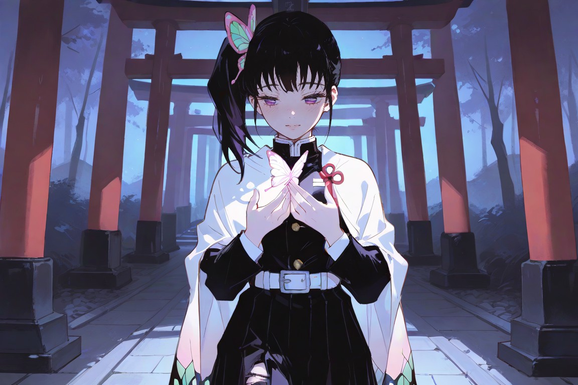 畫面中央,一位黑髮女子自信地佇立在紅色鳥居的襯托下,她頭戴粉藍色蝴蝶結髮飾。她身穿白色長裙,與深色頭髮和身後鮮豔的紅色鳥居形成鮮明對比。她手中輕柔地握著一朵小紅花。女子在鳥居前的站位賦予畫面深度,營造出層次感,引導觀者的視線從前景延伸至背景。女子的黑色輪廓和紅色鳥居與藍天白雲形成鮮明對比,為整體構圖增添了一抹戲劇性。儘管畫面元素簡潔——女子、長裙、手中的花朵和鳥居——卻傳遞出一種寧靜祥和之感。每個物體的位置、色彩和姿態都恰到好處,共同營造出這種氛圍。影像中沒有任何可辨識的文字或其他可能提供更多背景資訊或意義的物件。畫面中各物體的相對位置不變,女性位於中心位置,鳥居位於背景。整體構圖平衡和諧,每個元素都與其他元素相得益彰,共同構成一個連貫的視覺敘事。