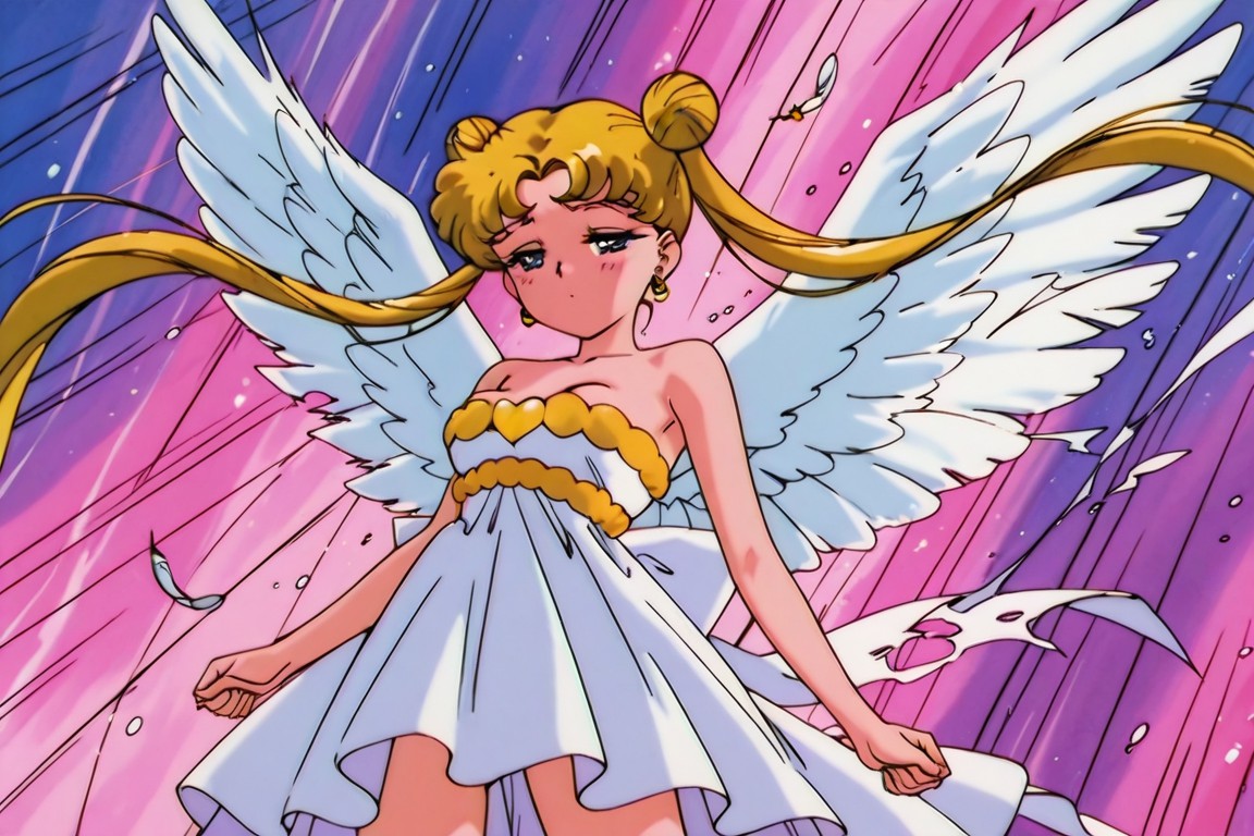 美少女戰士月野兔,畫面中心是一位年輕女孩。她有著金色的長髮,自然垂落在肩上,瀏海遮住了額頭。她的耳朵上戴著兩隻黃色的貓耳朵,為她的形象增添了一絲夢幻氣息。她身穿一襲及膝的白色連身裙,與她身後點綴著紫色和藍色的粉紅色背景形成鮮明對比,營造出一種夢幻或奇幻的氛圍。她左手拿著一朵黃玫瑰,鮮豔的玫瑰色在柔和的背景色調中格外醒目。她的目光看向一旁,彷彿被畫面之外的某件事所吸引。畫面中沒有任何文字或其他物體。物體的相對位置暗示著畫面的焦點集中在女孩身上,其他一切都只是作為背景,襯托出她的存在。畫面細節豐富,色彩鮮豔,但女孩顯然是畫面的主角。