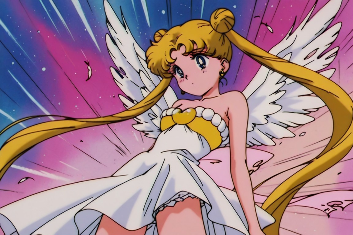 這張圖描繪了動畫《美少女戰士》中的一個場景,主角是月野兔。圖中月野兔以水手服高級戰士的身份出現,站在畫面中央。她有著金色的頭髮,兩側各別著一個金色的髮夾,顯得稚氣未脫。她穿著白色連身裙,腰間繫著粉紅色蝴蝶結,搭配黃色手套和靴子。她右手舉到胸前,擺出了英雄姿勢,這是水手戰士們準備戰鬥或保護朋友時常見的姿勢。月野兔身後是粉紫色漸變的夜空,點綴著星星和飄落的火花,更增添了畫面的戲劇性效果。圖中沒有任何文字。物體的相對位置表明月野兔是畫面的焦點,而星空背景則與她英勇的姿態相得益彰。色彩、物件及其排列方式共同營造出美少女戰士動畫系列特有的氛圍。