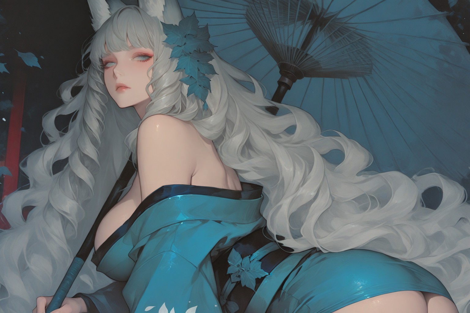 狐仙,畫面描繪了一位擁有飄逸長白髮的年輕女子。她耳後別著藍色花朵,頭上戴著與之相配的藍色髮箍。她身穿飾有藍色圖案的黑色長裙,與周圍環境的色彩和諧相融。左手握著一把藍紅相間的扇子,扇面微微張開,彷彿被一陣無形的微風吹拂。在她身後,繁星點點的深藍色夜空營造出一種神秘的氛圍,更增添了畫面的空靈之美。女子的目光投向畫面左側,似乎陷入沉思,或許正在觀察畫框之外的事物。整幅畫面彷彿凝固了時間,定格了這位年輕女子所處的寧靜而美麗的世界。