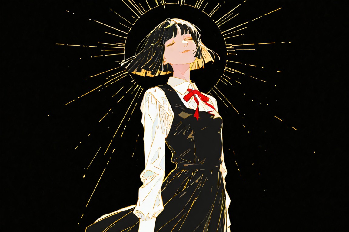 這是一幅日式JK剪影畫,畫面中心是女性。她一頭烏黑長髮披肩,用紅白條紋髮帶束起。她身穿白色襯衫搭配黑色裙子,更顯優雅氣質。她站在純黑色的背景前,背景如同畫布,襯托著她身後放射狀的太陽光芒。這道光芒由多道向四面八方延伸的光束組成,營造出引人入勝的視覺效果。女性的目光向上偏左,似乎在沉思或懷抱著某種憧憬。她在畫面中的位置,加上太陽光芒的映襯,讓人感覺她正凝視著畫框之外的某個地方,或許象徵著希望或抱負。整幅畫作中,人物與周遭環境形成了鮮明的對比,建構出一個強而有力的視覺敘事。女性的服飾、姿態以及周遭的元素都共同構成了這個敘事,各自發揮作用,共同講述著畫中的故事。