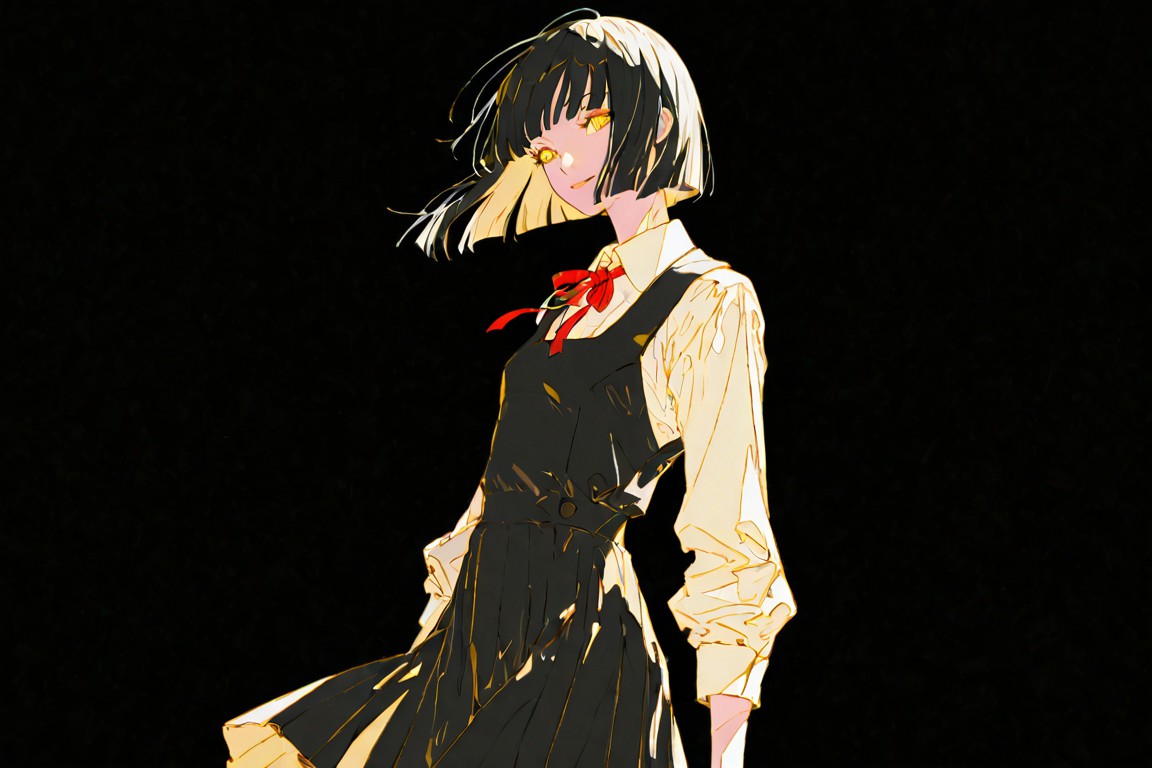 這是一幅日式JK剪影圖,畫面中一位女性邁步向右,姿態優雅。她身穿飾有金色點綴的黑色連身裙,頸間繫著一條紅色絲帶,為整體造型增添了一抹亮色。她的頭髮是齊耳短髮,瀏海自然垂落在額前。純黑色的背景與女性鮮豔的服飾形成鮮明對比,更突顯了她的身形。畫面中沒有任何文字或其他物體,女性似乎是這幅插畫的唯一焦點。