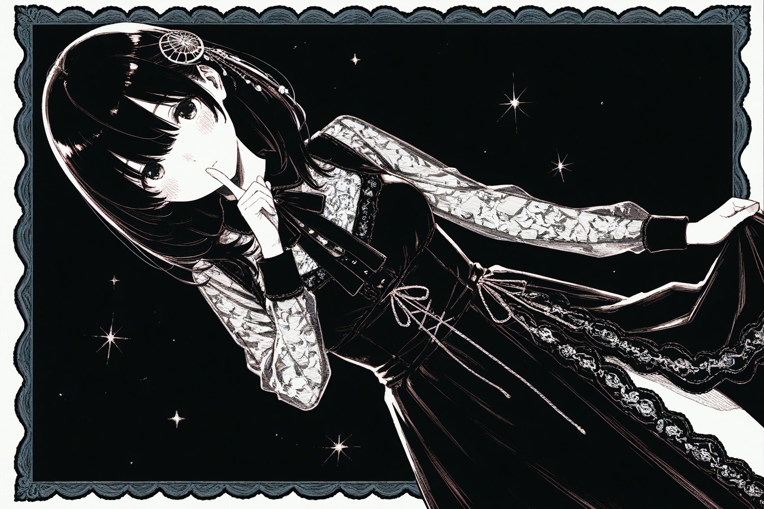 這幅黑白照片描繪了一位年輕女子。她長髮披肩,瀏海垂在臉頰兩側。她穿著深色連身裙,蕾絲領口和腰間蝴蝶結更添優雅氣質。她手捧一本小書,彷彿正全神貫注地閱讀。背景與人物形成鮮明對比,黑色底色點綴著白色星星,營造出繁星點點的夜空景象。畫面右下角的邊框與蕾絲領口的圖案相呼應,左上角則為扇形花邊。這樣的邊框設計既提升了整體構圖,又不會分散人們對人物的注意力。儘管是黑白照片,但畫面細節豐富,對比鮮明,極具視覺衝擊。女子的姿態暗示著她正在靜靜地沉思,或許是在欣賞手中那本小書。