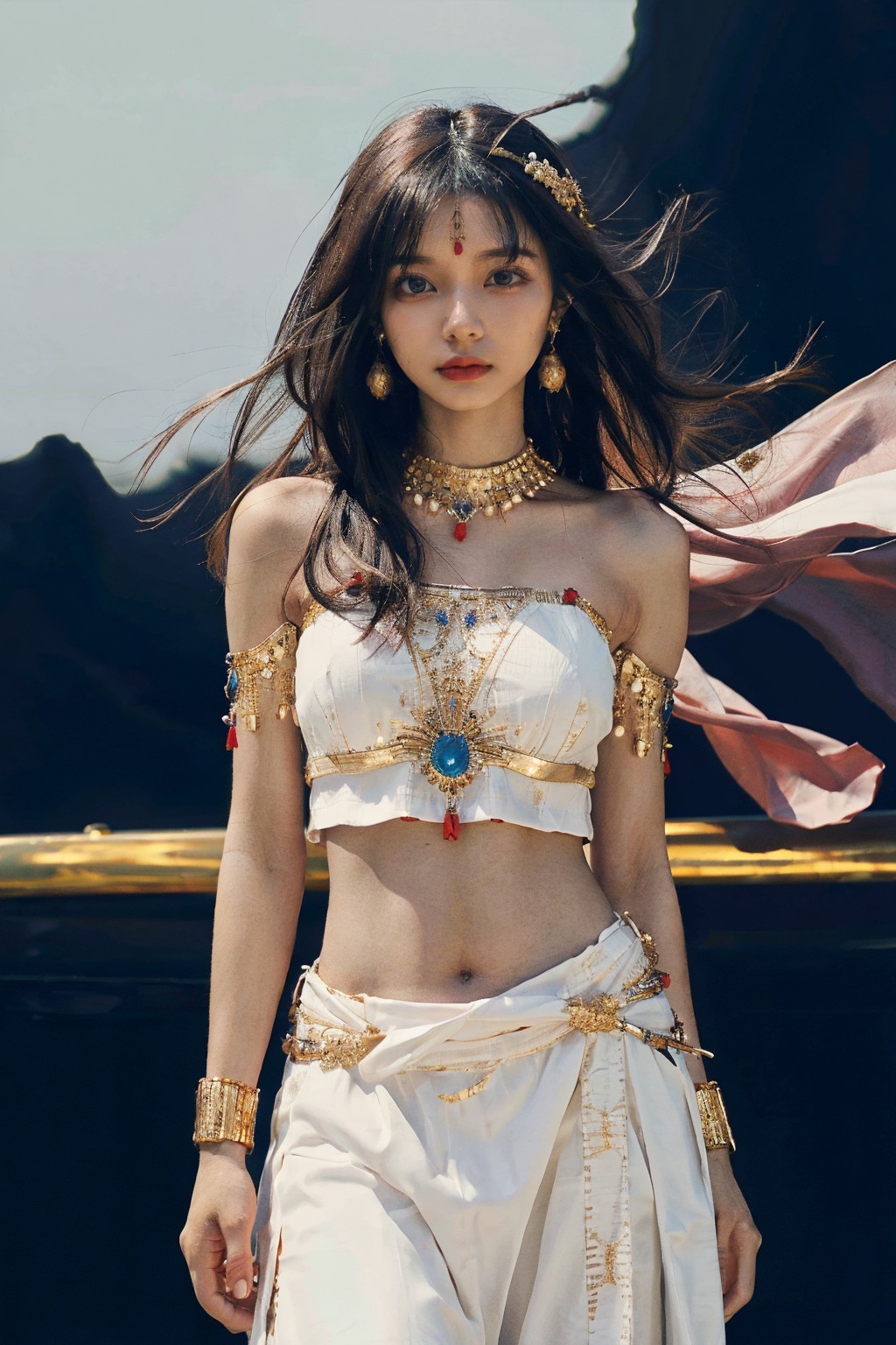畫面中央,一位埃及女神自信地佇立在深藍色背景前。她身著一套在燈光下熠熠生輝的白金服飾。修身的上衣勾勒出她曼妙的身姿,裙擺如瀑布般垂至腳踝,更添幾分優雅。她頭戴一頂鑲嵌著紅色寶石的頭飾,襯托著她披散在肩上的烏黑長髮。金色的首飾與她的服飾相得益彰,項鍊和耳環在燈光下熠熠生輝。她的目光略微側向一邊,似乎在看著畫面之外的某物或某人。她神情嚴肅,或許正經歷著什麼重要的時刻。這幅畫作定格了瞬間,女神成為視覺焦點,與深藍和白色的鮮明對比令人過目難忘。畫面中沒有任何文字或其他物品,使觀者的目光完全聚焦在她身上。畫面中物體的相對位置清晰明了:女子位於畫面中央,背景從四面八方環繞著她。這張圖像沒有任何美學上的修飾,只關注畫面中呈現的事實元素。它捕捉了一個瞬間:一位女子姿態沉穩、意志堅定,背景可以是世界上的任何地方。