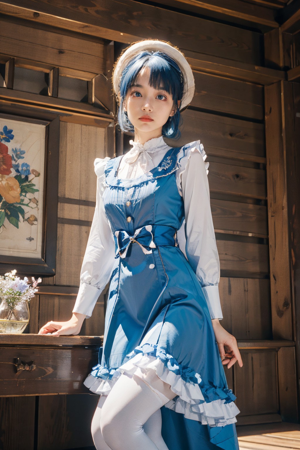 神裡綾香(原神) 圖片中央是一位藍髮少女。她身穿與髮色相襯的連身裙,裙子點綴著白色波點,腰間繫著藍色蝴蝶結。她的目光看向一旁,似乎正在沉思或觀察畫面之外的事物。場景設定在一個木質牆壁和地板的房間裡。一面牆上有一扇窗戶,但被窗簾部分遮擋,為畫面增添了一絲層次感。少女站在窗邊,或許是在享受陽光,或許只是在欣賞窗外的景色。在她面前,一張看似小桌子或書桌的物件上,擺放著一瓶插滿藍色鮮花的花瓶。花朵鮮豔的色彩與少女的頭髮和裙子相呼應,在畫面中營造出和諧的視覺效果。這些元素的精準擺放顯示構圖經過精心設計,很可能是為了追求美感而有意為之。圖片中沒有任何文字,物體的相對位置與描述相符。畫面中心人物顯然是女子,其他所有元素——窗戶、窗簾、桌子、花瓶和鮮花——都圍繞著她佈置。這種佈局營造出空間感和環境感,將畫面置於特定的場景中。