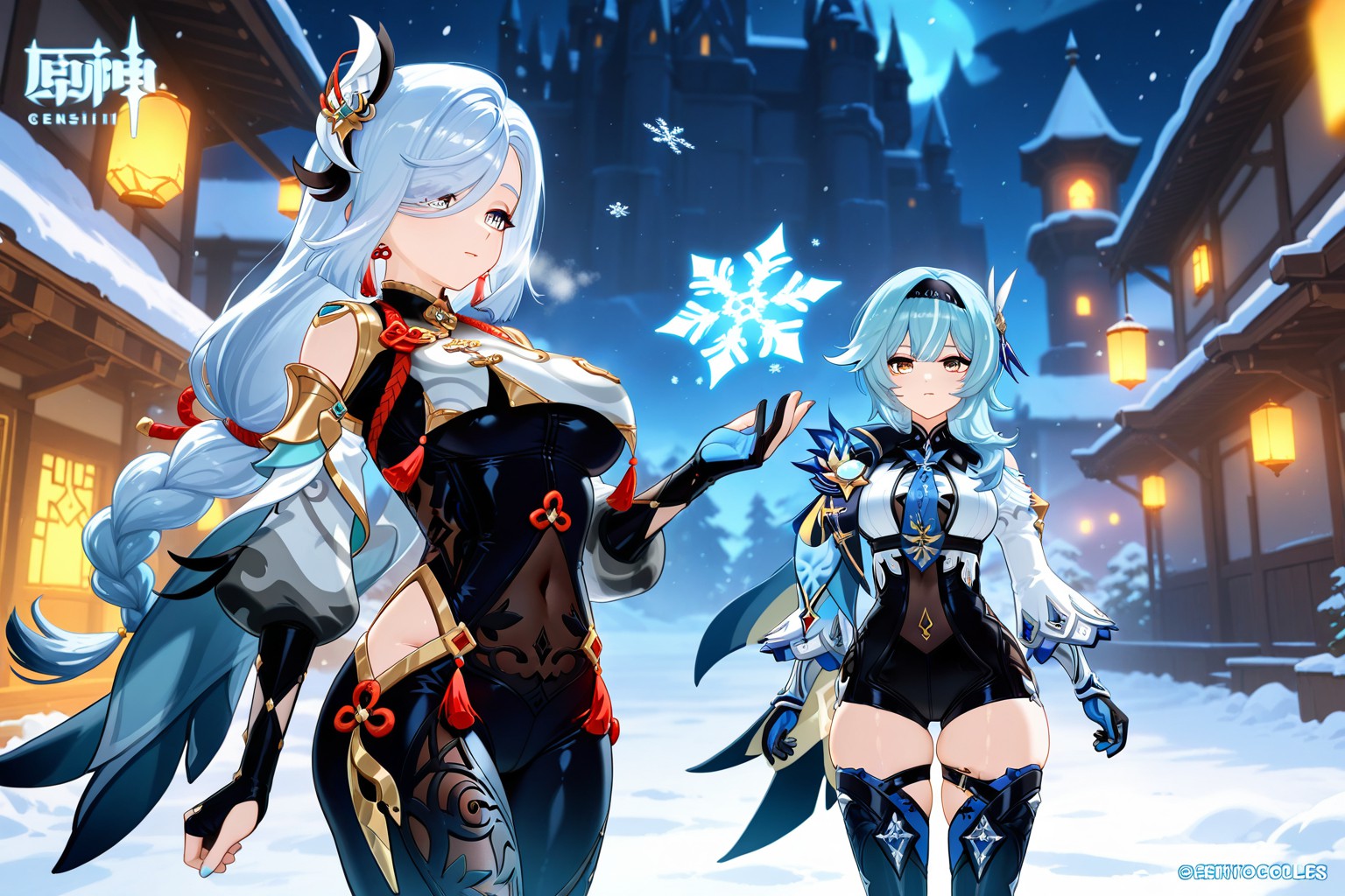 原神 eula shenhe,兩名女性角色站在雪城堡前。