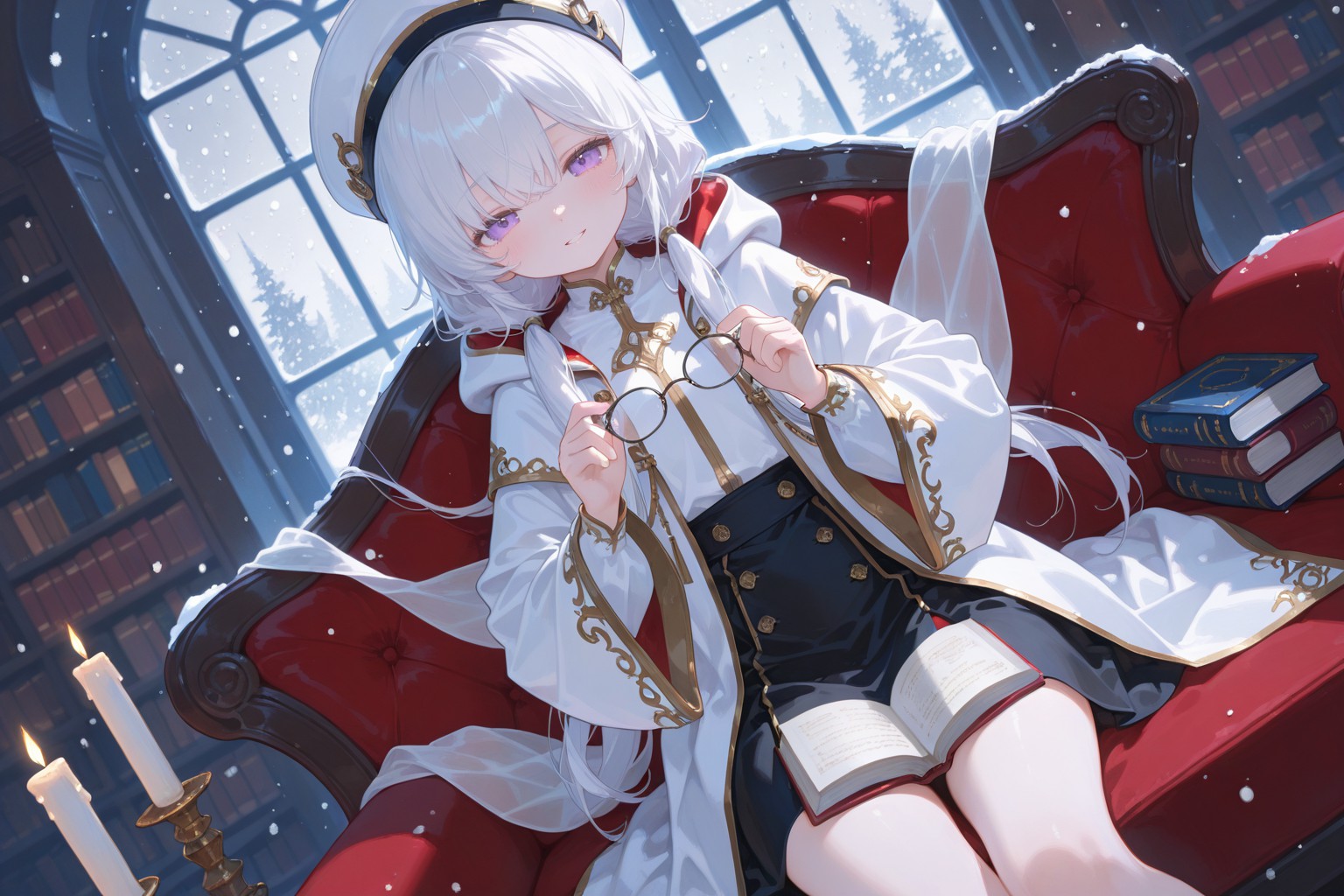 神秘城堡的女主人。畫面中央,一位留著白色長髮、齊瀏海的年輕女孩舒適地坐在紅色天鵝絨椅上。她身穿飾有金色滾邊的白色連身裙,腰間繫著一條與之相配的紅色腰帶。她一手拿著眼鏡,一手拿著書。她所在的房間散發著溫暖舒適的氣息。擺滿書籍的書架構成了畫面的背景,暗示她對閱讀的熱愛。掛著白色窗簾的窗戶透進柔和的光線,照亮了整個房間。窗台上點燃的一支蠟燭,為這幅畫面增添了一絲優雅。畫面中的每個物件都經過精心擺放,彼此之間達到了和諧的平衡。女孩、椅子、書架、書籍、窗簾和蠟燭,共同描繪出一幅寧靜祥和、時間彷彿凝固的畫面。