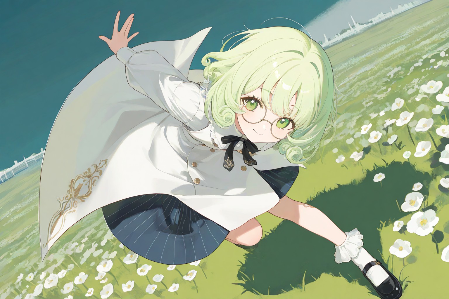 綠草地上,一個美麗的夢境。在蔚藍的天空中央,朵朵白雲點綴其間,一位年輕女子翩翩起舞,宛如在空中飛翔。她身穿綴滿黃色花朵的白色長裙,為整體造型增添了一抹亮麗的色彩。一條黑色絲帶纏繞著她的頭髮,與明亮的裙裝形成鮮明的對比。在這片蔚藍之中,她並非孤單一人;她身邊還有兩個夥伴──一隻藍色的貓咪棲息在她的左肩,一隻灰色的貓咪依偎在她的右臂。它們的出現為這幅畫面增添了一絲奇趣。女子的目光向下,落在散落著白色花朵的地面上。或許她正在沉思大自然的美景,或許只是在欣賞眼前的風景。畫面中每個物體的位置和相對位置,共同描繪出一幅寧靜祥和的空中之旅的生動景象。