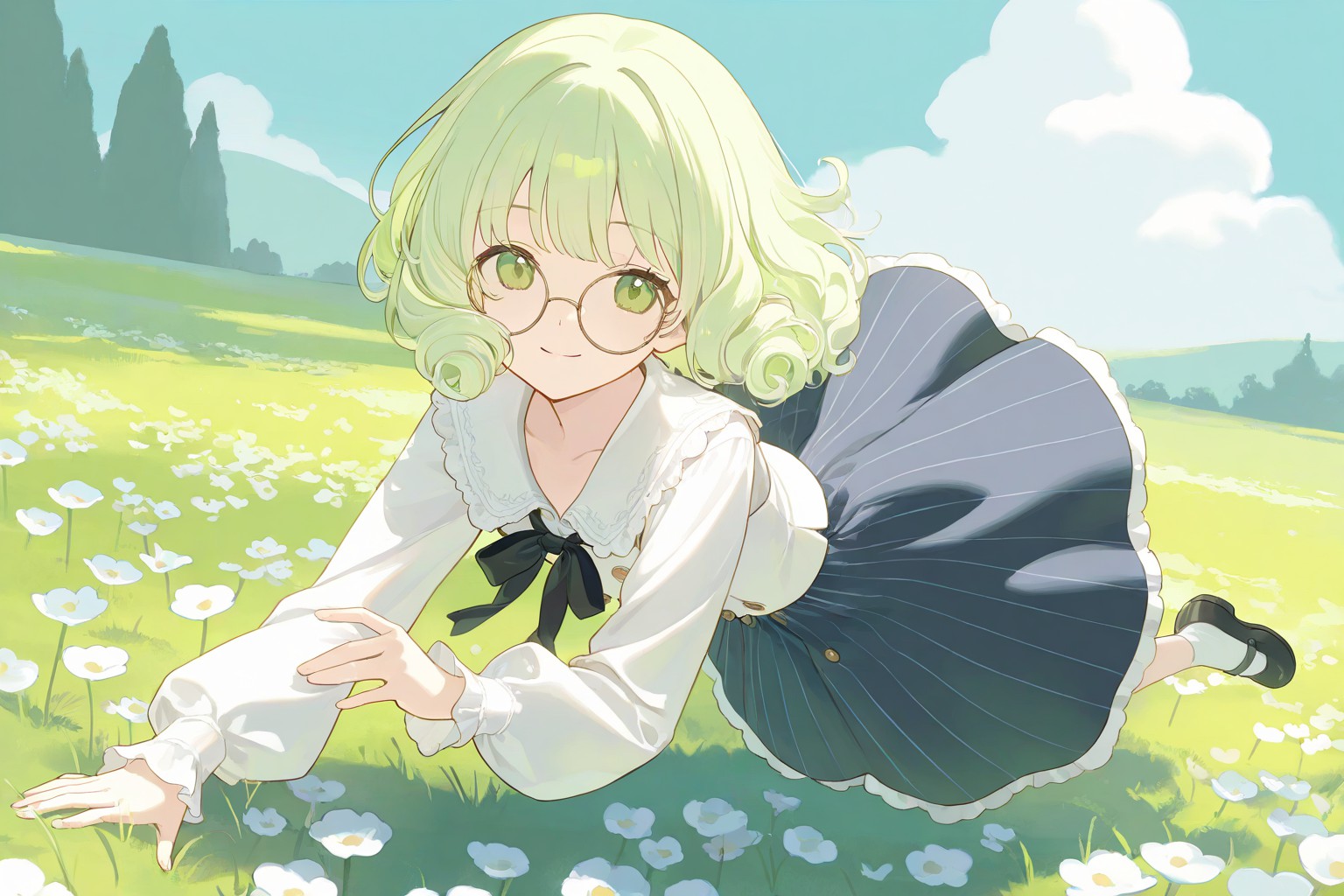 一幅美麗的夢境,發生在綠茵的草地上。畫面中,一位年輕女孩戴著眼鏡,一頭翠綠的頭髮格外引人注目。她舒適地坐在點綴著白色小花的草地上。她穿著白色襯衫,領口繫著藍色蝴蝶結,搭配同色系藍色短裙,更添幾分優雅,與她青春的魅力相得益彰。背景是起伏的丘陵,湛藍的天空下飄著朵朵白雲,構成一幅田園詩般的風景。女孩的目光投向畫面左側,遠處一座城堡隱約可見,為畫面增添了一絲神秘和冒險的氣息。畫面中的每個元素都經過精心安排,前景與背景之間達到了和諧的平衡。女孩在草地上的姿態,她與自然環境的對比,以及城堡在天空中巍然聳立——所有這些元素共同構成了一幅既迷人又引人入勝的如畫美景。
