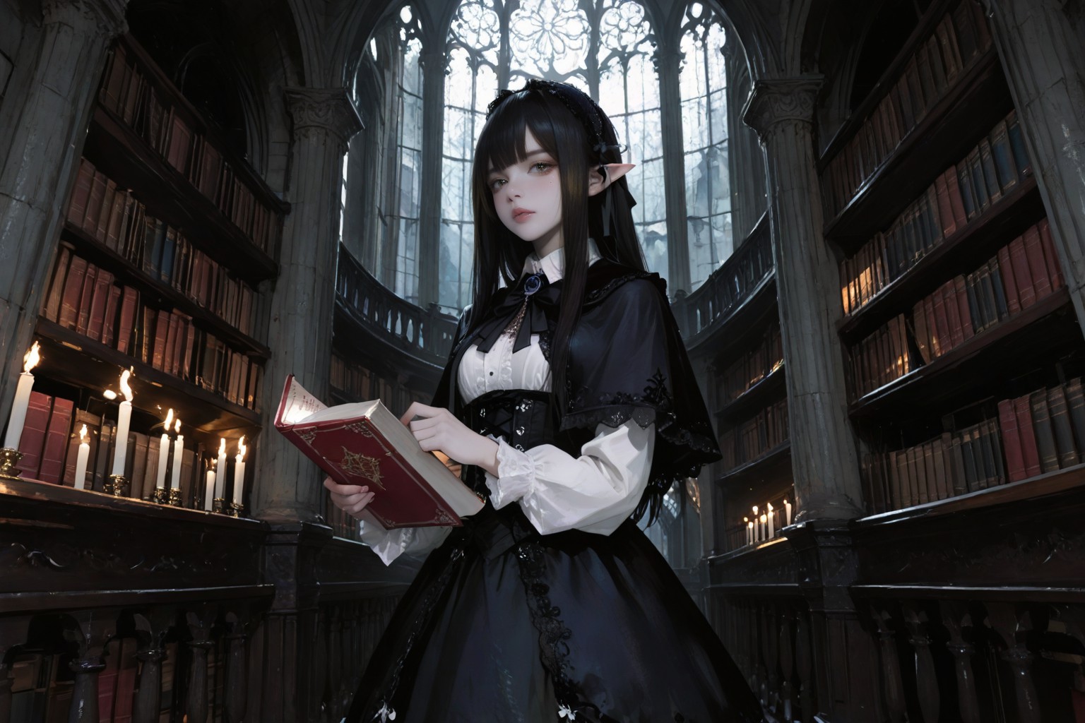 教堂的陰影。在宏偉圖書館的中心,一位長髮飄飄的年輕女子靜靜佇立,成為畫面的焦點。她身穿黑白相間的長裙,雙手輕柔地捧著一本攤開的書,書放在胸前。她的目光看向一旁,臉上帶著沉思的神情。圖書館本身就是一座建築奇蹟,一排排書架上擺滿了書籍,綿延至遠方,營造出深邃而廣闊的空間感。上方,彩色玻璃窗點綴著高高的天花板,將萬花筒般的色彩投射到畫面上。幾支蠟燭,燭光搖曳,點綴著圖書館,散發出溫暖的光芒,與透過窗戶看到的湛藍夜空形成鮮明的對比。每件物品的精準擺放以及它們之間的相對位置,共同構成了一幅和諧的畫面,捕捉到了女子在圖書館的莊嚴氛圍中沉思的瞬間。