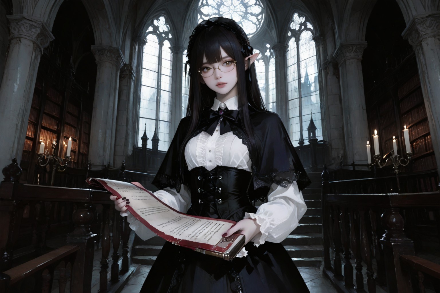 教堂的陰影:在宏偉的大教堂中心,一位年輕女子佇立於畫面中央。她身穿黑白相間的服飾,與垂至肩頭的烏黑長髮形成鮮明對比。她優雅的衣著更添幾分高貴氣質。她左手拿著一本紅色的書,內容不明,卻引人遐想。右手則拿著一捲軸,捲軸上密密麻麻的黑色文字在紅色背景的映襯下格外醒目。她周圍的大教堂宏偉壯麗,高聳的拱形穹頂令人嘆為觀止,彩色玻璃窗點綴著牆壁,將五彩斑斕的光影灑滿整個空間。女子站在通往教堂入口的階梯上,彷彿在邀請觀者進入這幅畫面。畫面中的每個元素都巧妙地融合在一起,構成了一幅引人入勝的敘事,讓人不禁好奇背後的故事──這位女子是誰?她在教堂裡的目的是什麼?那本紅色的書和捲軸又代表著什麼?