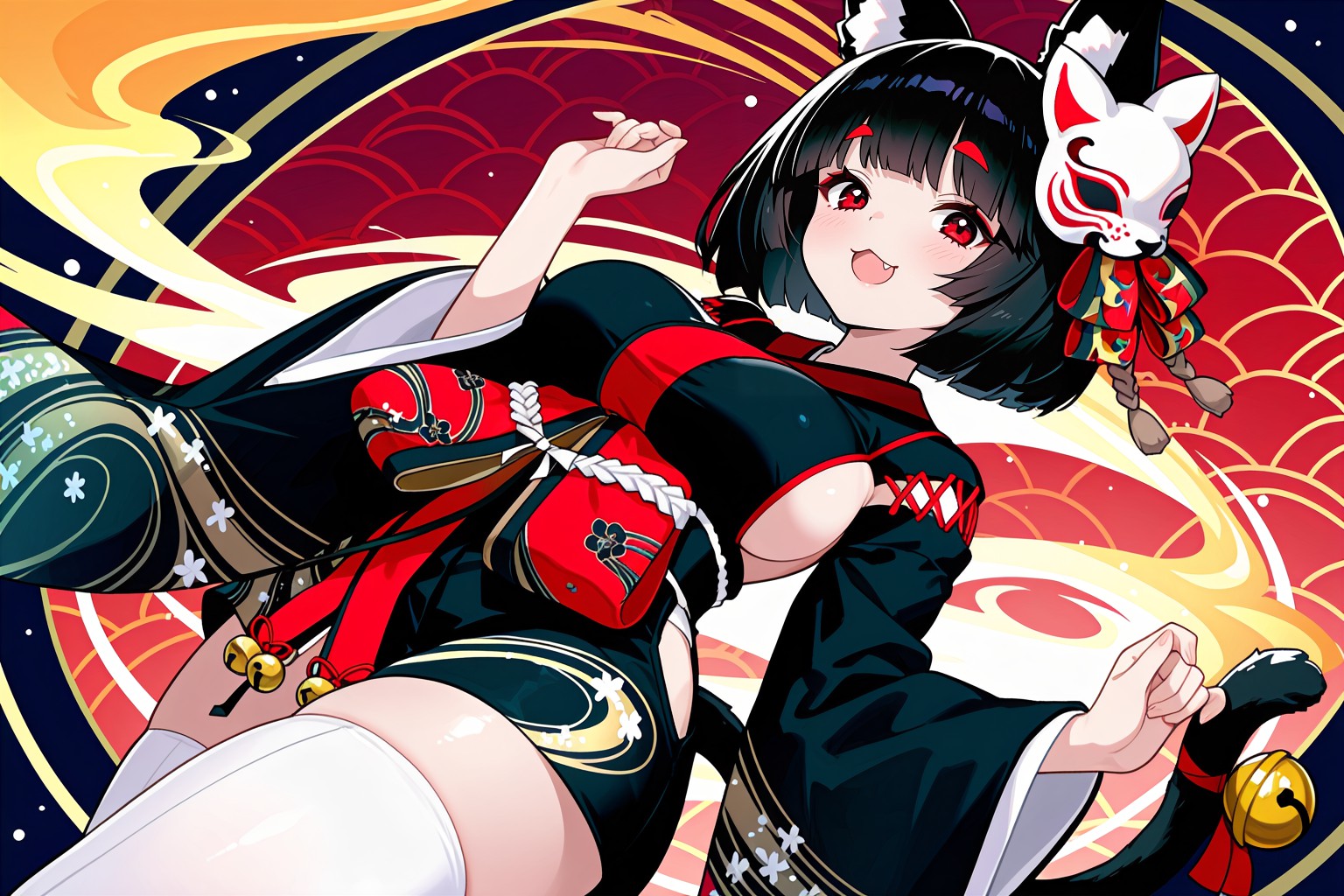 在《碧藍航線》的山城篇中,畫面中央是一位年輕女子,她正沉浸在喜悅之中。她穿著傳統的日式和服,黑色底色點綴著紅色和金色。和服優雅地垂落在她身上,與她烏黑的秀髮形成鮮明的對比。她燦爛的笑容為畫面增添了一抹溫暖。在她臉龐的兩側,各有一隻小動物──左邊是一隻戴著紅色項圈的白貓,右邊是一條黑金相間的魚。它們彷彿也是這歡樂景象的一部分,目光緊緊地註視著這名女子。背景是一幅以橙色和紅色為主色調的抽象壁畫,飾以圓形和線條圖案。這種設計為畫面增添了層次感,為女子和她的夥伴們營造了一個充滿活力的背景。總而言之,這幅畫作完美地融合了傳統與奇幻,每個元素都為畫面的整體敘事增添了色彩。
