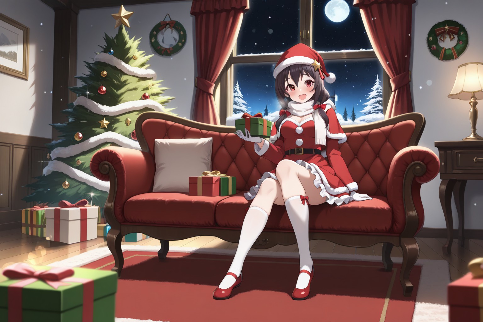 聖誕節獨處時光。在溫暖燈光灑滿的舒適客廳中央,一位小女孩坐在鮮豔的紅色沙發上。她身著節慶盛裝,頭戴紅色帽子,腳蹬與沙發顏色相配的紅色靴子。她手中拿著兩份用閃亮金箔紙包裹的禮物,準備送出去。房間裡到處都洋溢著聖誕氣息,女孩身後矗立著一棵裝飾精美的聖誕樹。沙發後面的牆上掛滿了花圈和聖誕襪,更添節慶氣氛。一扇掛著紅色窗簾的窗戶透進柔和的陽光,照亮了整個房間。沙發旁的小桌上擺放著兩份用紅色錫箔紙包裹的禮物。這些禮物,連同女孩手中的禮物,都預示著即將到來的互贈禮物的美好時刻。整個場景充滿了節慶的歡樂氣氛,也讓人對聖誕節的早晨充滿期待。