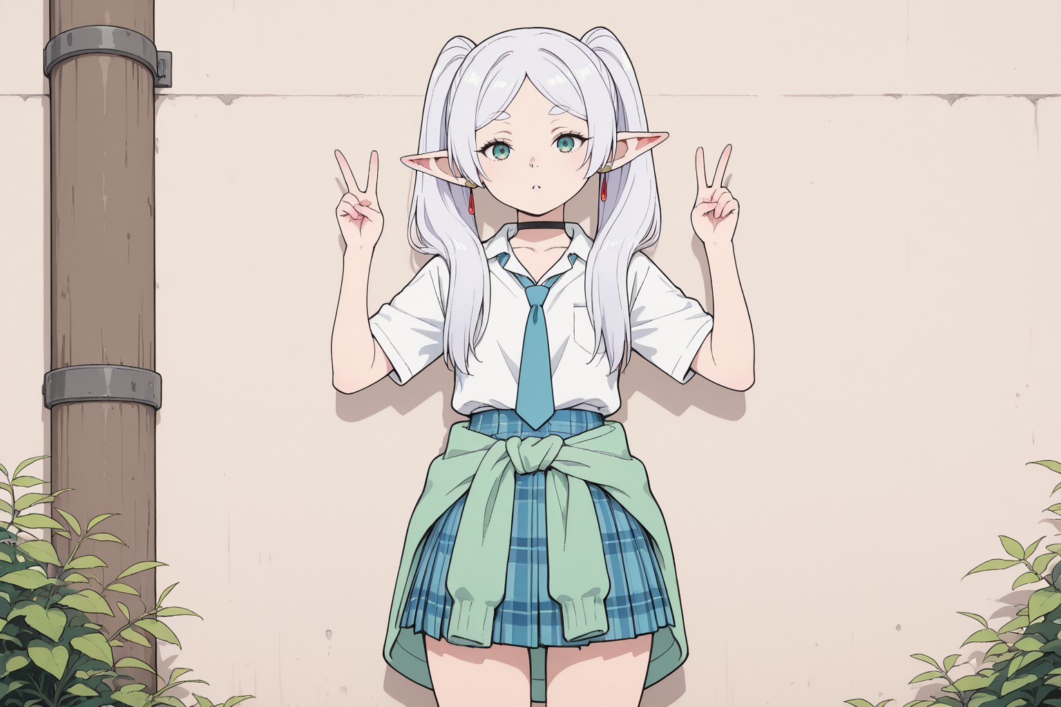 弗里利安都市奇幻風格。這幅數位插畫描繪了一位年輕女孩,她有著迷人的藍色眼睛和金色的頭髮,頭髮上點綴著粉紅色蝴蝶結。她靠在一面米色的牆上,牆的左側有一根棕色的管道垂直貫穿。女孩身穿白色襯衫,搭配綠色領結和藍色裙子。她雙手比出和平手勢,直視鏡頭,構成了一幅引人入勝的肖像。