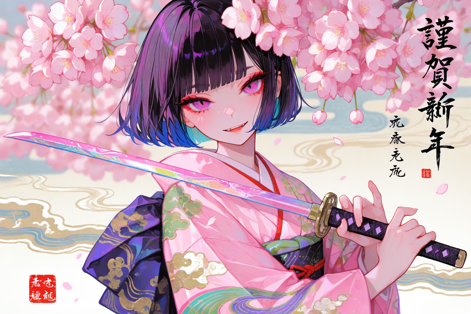 新年櫻花盛開,一位粉紅色頭髮的女子手持寶劍。