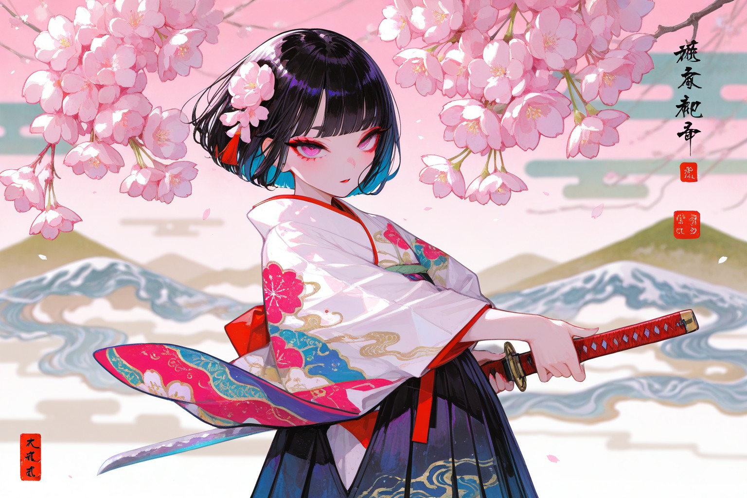 新年櫻花盛開,一位黑髮少女身穿和服,手持紅劍。