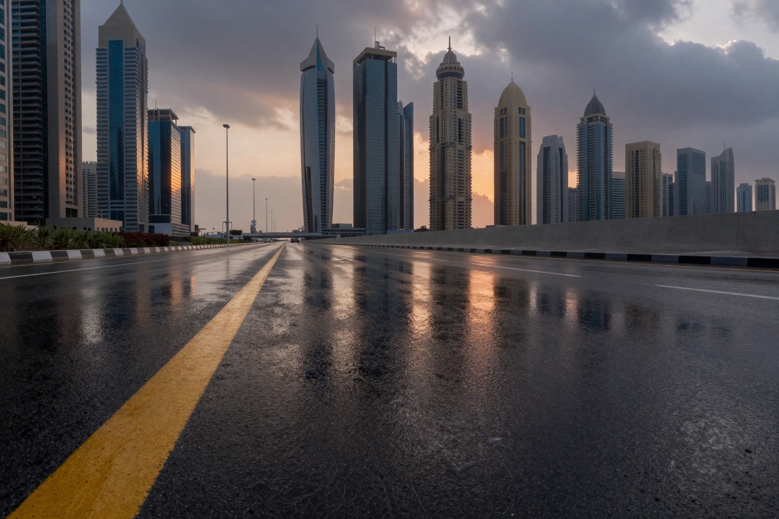 通往城市的道路,城市天際線被雲層籠罩,街道濕漉漉的。